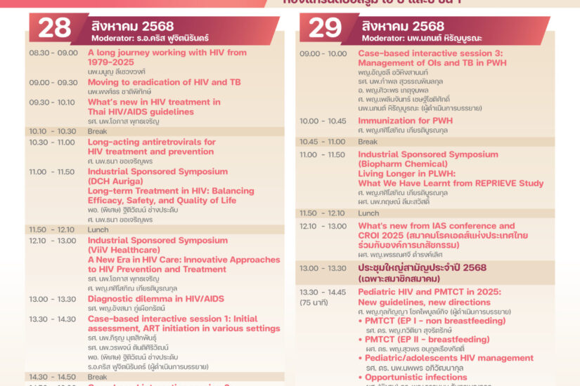 อบรมเชิงปฏิบัติการ การดูแลรักษาผู้ติดเชื้อเอชไอวี/เอดส์ ครั้งที่ 24 24th HIV/AIDS Workshop 2025 สมาคมโรคเอดส์แห่งประเทศไทย ขอเรียนเชิญแพทย์และบุคลากรทางการแพทย์เข้าร่วมอบรมเชิงปฏิบัติการเรื่องการดูแลรักษาผู้ติดเชื้อเอชไอวี/เอดส์ ครั้งที่ 24 ในวันที่ 28-29 สิงหาคม พ.ศ.2568 ณ ห้องประชุมแกรนด์บอลรูม เอ บี และซี ชั้น 1 โรงแรมแมนดาริน สามย่าน กรุงเทพฯ โดยการอบรมนี้มีวัตถุประสงค์เพื่อเพิ่มทักษะความรู้ให้แก่บุคลากรทางการแพทย์ ทั้งนี้ผู้เข้ารับการอบรมมีสิทธิ์เข้ารับการอบรมโดยไม่ถือเป็นวันลา สามารถเบิกค่าลงทะเบียน ค่าที่พัก และค่าเดินทางได้จากต้นสังกัด โดยผู้เข้ารับการอบรมจะต้องได้รับอนุญาตจากผู้บังคับบัญชาตามหนังสือกระทรวงการคลังว่าด้วยเรื่องระเบียบกระทรวงการคลัง สมาคมโรคเอดส์แห่งประเทศไทยกำหนดจัดกิจกรรมการอบรม 3 กิจกรรม ได้แก่ กรุณาคลิกที่รูปภาพเพื่อดาวน์โหลดโปรแกรมการอบรม (pdf) การอบรม Pre Congress: 24th HIV/AIDS Workshop 2025การอบรม Pre Congress: 24th HIV/AIDS Workshop 2025วันที่ 27 สิงหาคม พ.ศ.2568 ณ…