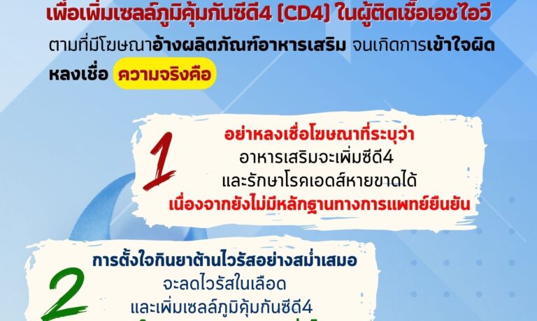 ประกาศเตือน เรื่อง ผลิตภัณฑ์อาหารเสริมเพื่อเพิ่มเซลล์ภูมิคุ้มกันซีดี4 (CD4) ในผู้ติดเชื้อเอชไอวี โดย สมาคมโรคเอดส์แห่งประเทศไทย และ กองโรคเอดส์และโรคติดต่อทางเพศสัมพันธ์ กรมควบคุมโรค ตามที่มีโฆษณาอ้างผลิตภัณฑ์อาหารเสริม จนเกิดการเข้าใจผิดหลงเชื่อ ความจริงคือ อย่าหลงเชื่อโฆษณาที่ระบุว่า อาหารเสริมจะเพิ่มซีดี4 และรักษาโรคเอดส์หายขาดได้ เนื่องจากยังไม่มีหลักฐานทางการแพทย์ยืนยัน การตั้งใจกินยาต้านไวรัสอย่างสม่ำเสมอ จะลดไวรัสในเลือดและเพิ่มเซลล์ภูมิคุ้มกันซีดี4 ทำให้มีสุขภาพดีเช่นคนทั่วไป ระดับเซลล์ภูมิคุ้มกันซีดี4 ที่เกิน 200 เซลล์ต่อ ลบ.มม. เพียงพอในการป้องกันการเจ็บป่วยจากโรคฉวยโอกาส