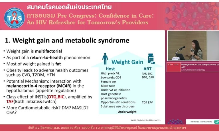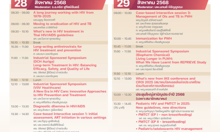 อบรมเชิงปฏิบัติการ การดูแลรักษาผู้ติดเชื้อเอชไอวี/เอดส์ ครั้งที่ 24 24th HIV/AIDS Workshop 2025 สมาคมโรคเอดส์แห่งประเทศไทย ขอเรียนเชิญแพทย์และบุคลากรทางการแพทย์เข้าร่วมอบรมเชิงปฏิบัติการเรื่องการดูแลรักษาผู้ติดเชื้อเอชไอวี/เอดส์ ครั้งที่ 24 ในวันที่ 28-29 สิงหาคม พ.ศ.2568 ณ ห้องประชุมแกรนด์บอลรูม เอ บี และซี ชั้น 1 โรงแรมแมนดาริน สามย่าน กรุงเทพฯ โดยการอบรมนี้มีวัตถุประสงค์เพื่อเพิ่มทักษะความรู้ให้แก่บุคลากรทางการแพทย์ ทั้งนี้ผู้เข้ารับการอบรมมีสิทธิ์เข้ารับการอบรมโดยไม่ถือเป็นวันลา สามารถเบิกค่าลงทะเบียน ค่าที่พัก และค่าเดินทางได้จากต้นสังกัด โดยผู้เข้ารับการอบรมจะต้องได้รับอนุญาตจากผู้บังคับบัญชาตามหนังสือกระทรวงการคลังว่าด้วยเรื่องระเบียบกระทรวงการคลัง สมาคมโรคเอดส์แห่งประเทศไทยกำหนดจัดกิจกรรมการอบรม 3 กิจกรรม ได้แก่ กรุณาคลิกที่รูปภาพเพื่อดาวน์โหลดโปรแกรมการอบรม (pdf) การอบรม Pre Congress: 24th HIV/AIDS Workshop 2025การอบรม Pre Congress: 24th HIV/AIDS Workshop 2025วันที่ 27 สิงหาคม พ.ศ.2568 ณ…