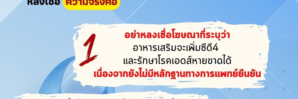 ประกาศเตือน เรื่อง ผลิตภัณฑ์อาหารเสริมเพื่อเพิ่มเซลล์ภูมิคุ้มกันซีดี4 (CD4) ในผู้ติดเชื้อเอชไอวี โดย สมาคมโรคเอดส์แห่งประเทศไทย และ กองโรคเอดส์และโรคติดต่อทางเพศสัมพันธ์ กรมควบคุมโรค ตามที่มีโฆษณาอ้างผลิตภัณฑ์อาหารเสริม จนเกิดการเข้าใจผิดหลงเชื่อ ความจริงคือ อย่าหลงเชื่อโฆษณาที่ระบุว่า อาหารเสริมจะเพิ่มซีดี4 และรักษาโรคเอดส์หายขาดได้ เนื่องจากยังไม่มีหลักฐานทางการแพทย์ยืนยัน การตั้งใจกินยาต้านไวรัสอย่างสม่ำเสมอ จะลดไวรัสในเลือดและเพิ่มเซลล์ภูมิคุ้มกันซีดี4 ทำให้มีสุขภาพดีเช่นคนทั่วไป ระดับเซลล์ภูมิคุ้มกันซีดี4 ที่เกิน 200 เซลล์ต่อ ลบ.มม. เพียงพอในการป้องกันการเจ็บป่วยจากโรคฉวยโอกาส