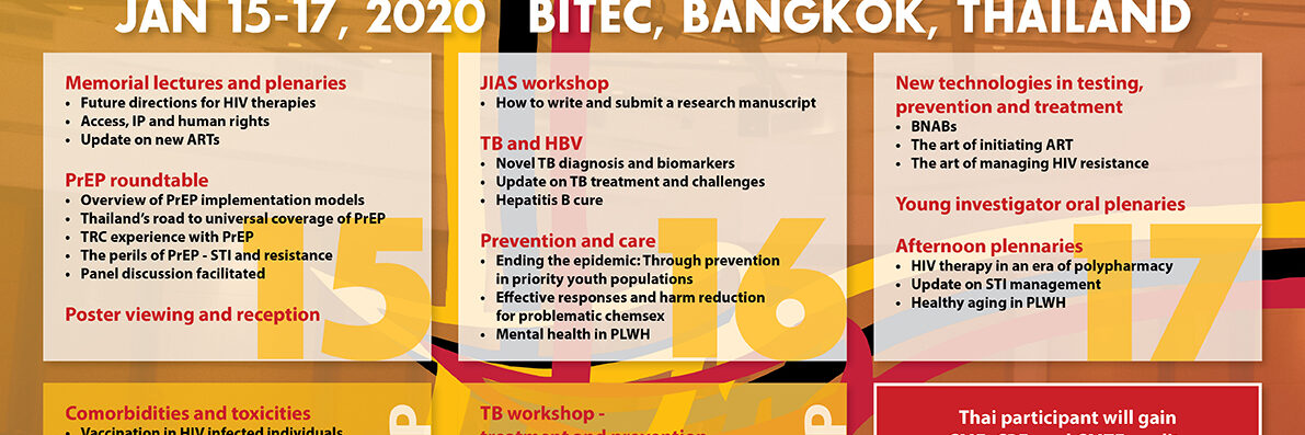 Sep12019 ประชุม / อบรมภายในประเทศ 22nd Bangkok International Symposium on HIV Medicine 2020 By Tom Pornwinit1 กันยายน 2562 January 15-17, 2020 at BITEC, Bangkok Details