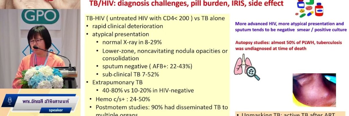 Breaking barriers in TB care: Latest strategies for HIV-infected individuals หัวข้อบรรยาย: Breaking barriers in TB care: Latest strategies for HIV-infected individuals บรรยายโดย: พญ.อัญชลี อวิหิงสานนท์ งานประชุมการดูแลรักษาผู้ติดเชื้อเอชไอวี/เอดส์ ครั้งที่ 23 (HIV/AID Workshop 2024) 22-23 สิงหาคม 2567 ห้องแกรนด์บอลรูม เอ บี และซี ชั้น 1 โรงแรมแมนดารินกรุงเทพ สามย่าน