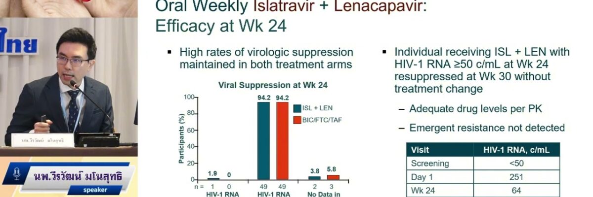 What is new in HIV treatment in 2024 หัวข้อบรรยาย: What is new in HIV treatment in 2024 บรรยายโดย: นพ.วีรวัฒน์ มโนสุทธิ งานประชุมการดูแลรักษาผู้ติดเชื้อเอชไอวี/เอดส์ ครั้งที่ 23 (HIV/AID Workshop 2024) 22-23 สิงหาคม 2567 ห้องแกรนด์บอลรูม เอ บี และซี ชั้น 1 โรงแรมแมนดารินกรุงเทพ สามย่าน